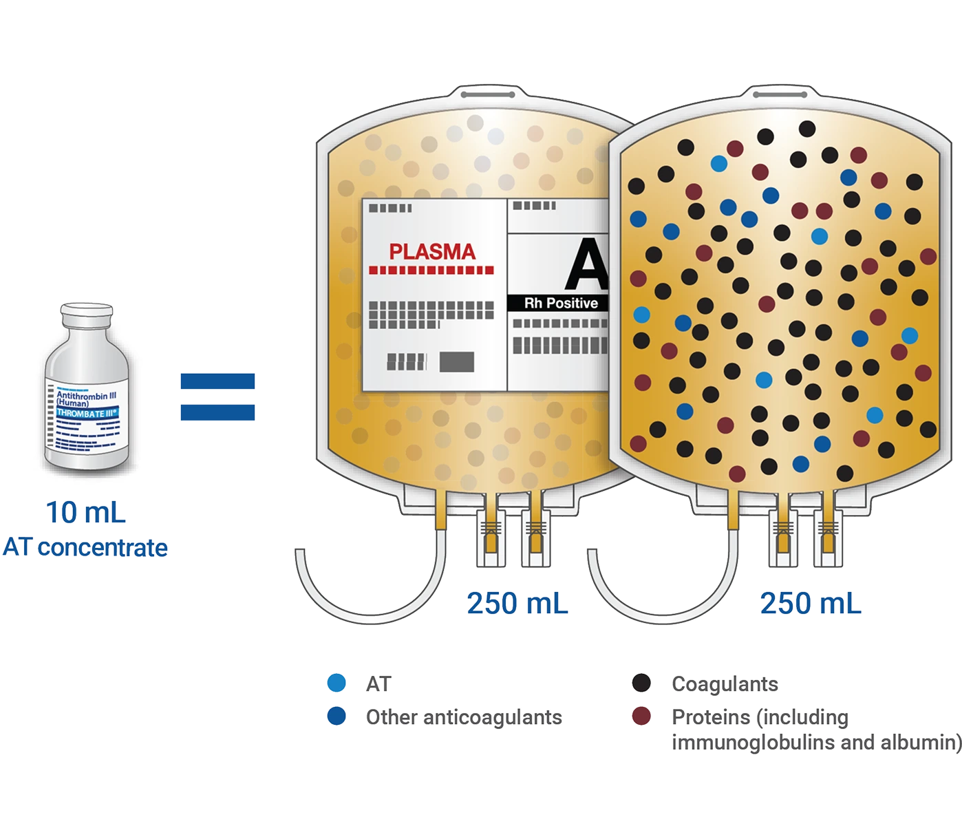 THROMBATE III delivers 50x more antithrombin (AT) than the same amount of fresh frozen plasma (FFP)—and none of the additional proteins and factors1,2